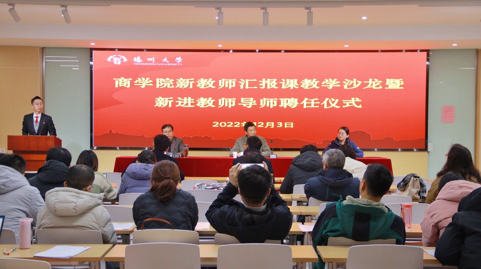 在2022年12月3日的商学院2022年度新教师汇报课教学沙龙暨新进教师导师聘任仪式中,曹峻玮博士作为新进教师代表进行了发言。
